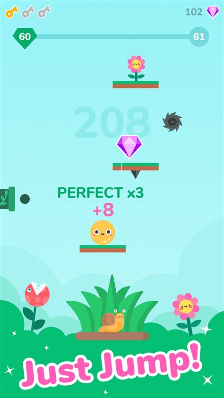 To get the flowers at the top, the brave little ball needs to overcome the difficulties and obstacles all the way by jumping up and up!