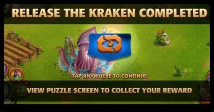 You now need to drag 2 builder adult villagers to push the stones at the same time so they fall. When the stones have been pushed over the Kraken will appear and you can now go to the 'Puzzles' screen and collect your 3 Lavastones.
